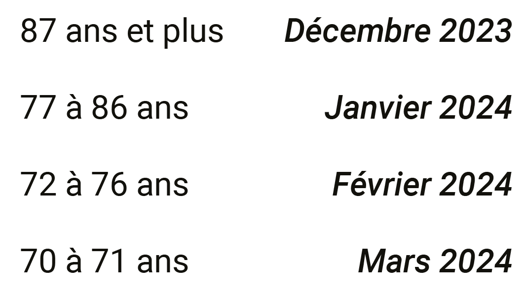 À partir de la mi-décembre 2023, des lettres seront envoyées aux aînés, en commençant par ceux de 87 ans et plus, puis en diminuant l’âge chaque mois jusqu’à ceux de 70 ans et plus d’ici mars 2024. La lettre contiendra un code et des instructions pour faire une demande par téléphone. Les aînés de 65 à 69 ans, les détenteurs du crédit d’impôt pour personnes handicapées et les parents d’enfants de moins de 18 ans devront faire une demande en ligne à partir de juin.